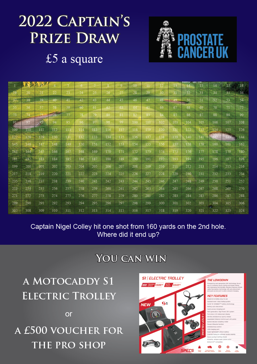 The 2022 Club Captain Nigel Colley is running a prize draw in aid of raising money for his nominated charity, Prostate Cancer UK. The draw which is now up in the clubhouse, costs £5 per square, and will be decided by Nigel hitting a shot at the 2nd green from 160 yards. There are more than 300 squares to choose from, ranging from on the green to in the bunkers or even further afield!