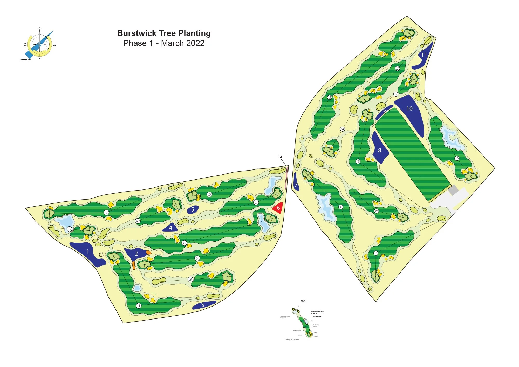 There are 12 areas that have been planted on the course which can be seen on the map, and all trees are planted as whips with stakes and tube guards.