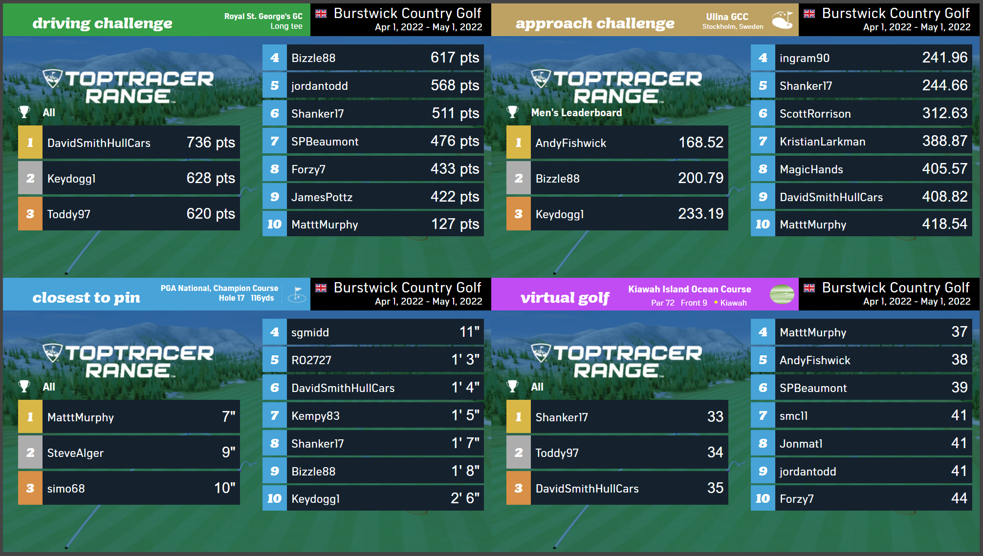 Come to our Toptracer driving range in February to take part in our four free competitions! As of 1pm on 24th March the current leaders are: