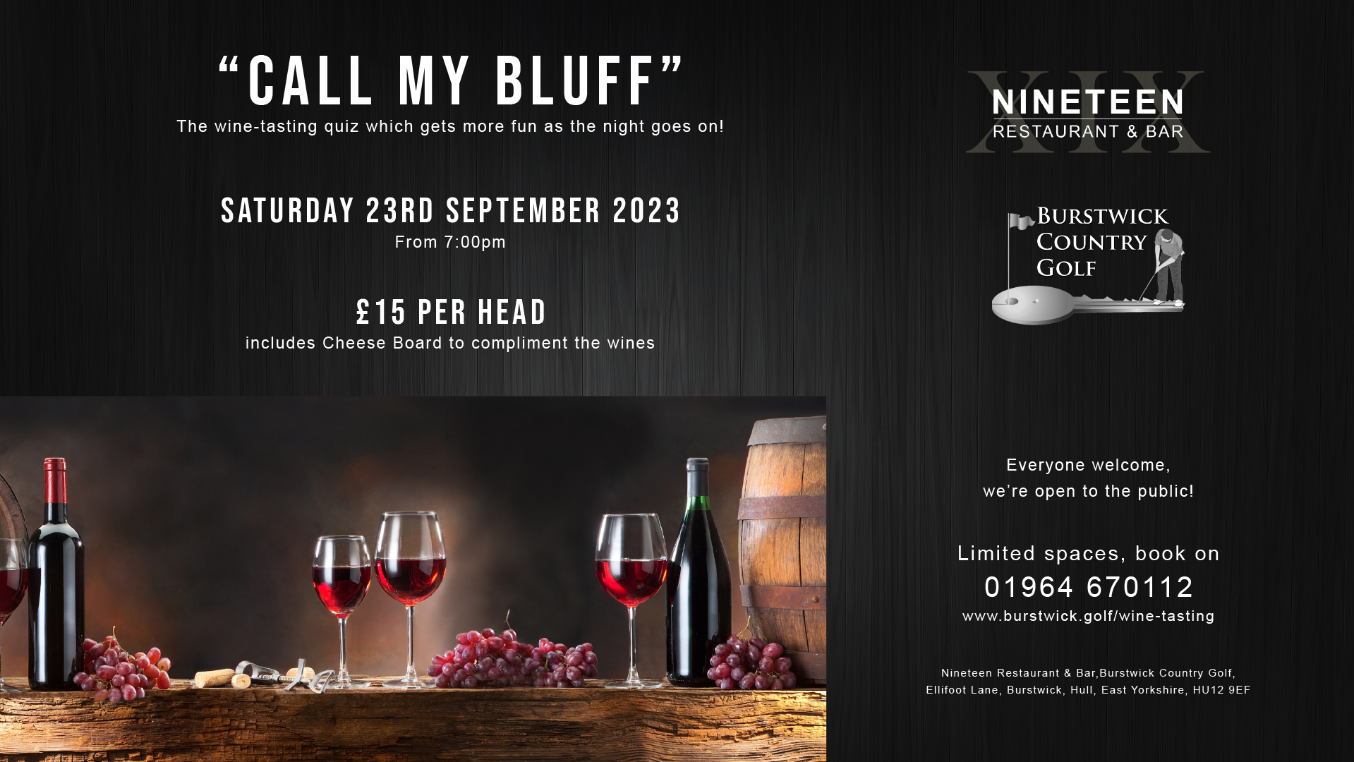 Join us from 7pm on Saturday 23rd September for a night of fun, testing your taste buds and attempting to win a bottle of champagne in a game of Call My Bluff!