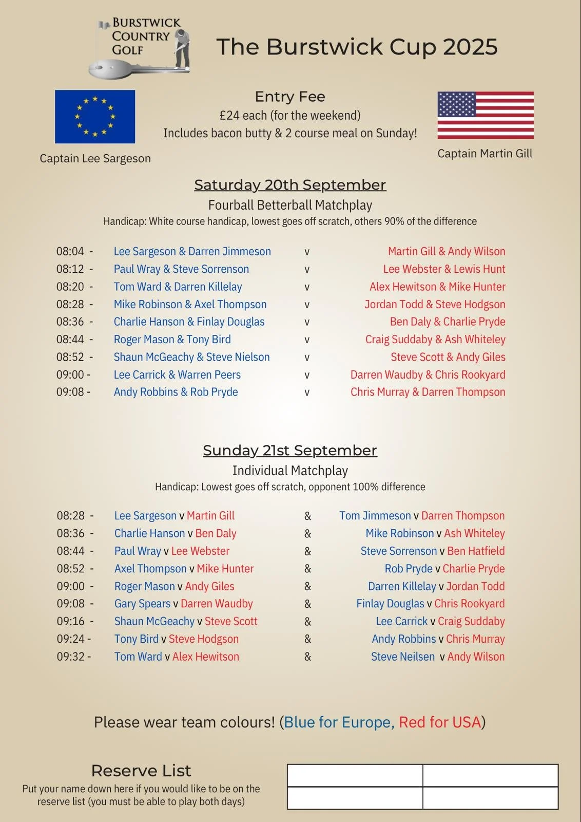 Who will win the Burstwick Cup, Europe or USA? Team Captains Lee Sargeson and Martin Gill have drawn the teams for next weekend, and it's due to be a great brawl!