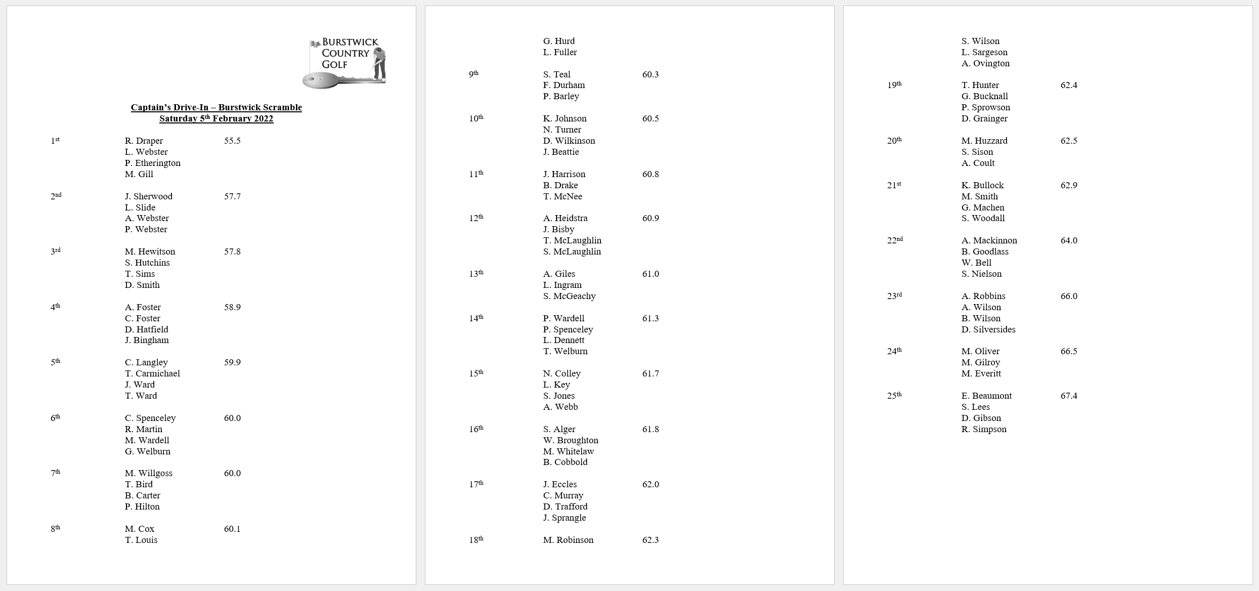 Here are the results from Saturday’s Captain’s Drive-In Burstwick Scramble.