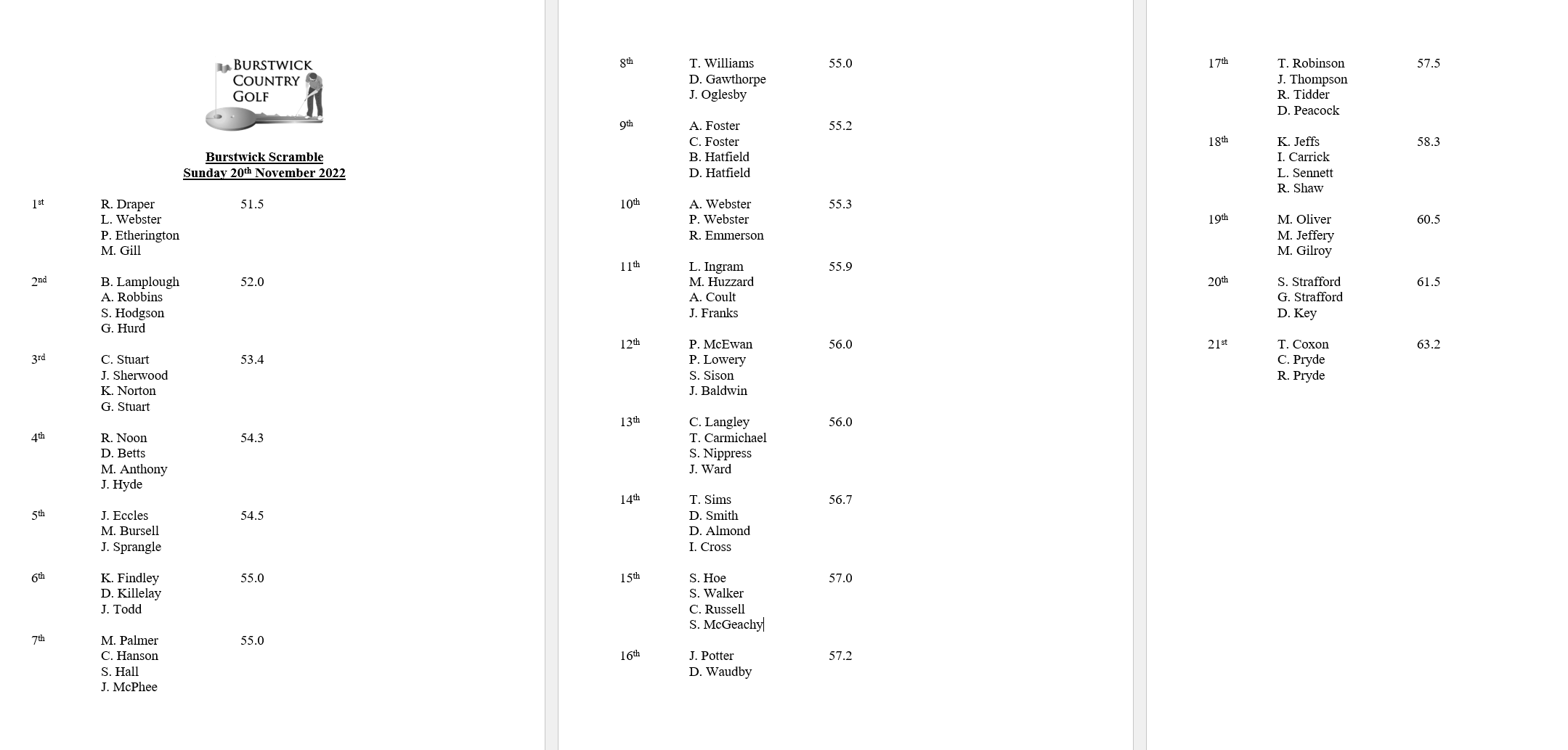 Here are the results from Sunday’s Burstwick Scramble, because we can't run the results on Club V1 (due to our rules using the old handicap allowance) they don't go onto HDID.